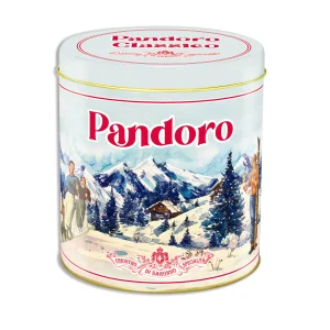 Pandoro clásico en elegante lata de metal Esquiadores. Pandoro Chiostro di Saronno se elabora según la receta tradicional, basada en una lenta fermentación natural, y todos los ingredientes, desde la harina hasta la leche, desde los huevos hasta la mantequilla y la levadura, son de origen natural, frescos y genuinos, sin conservantes ni colorantes. El pandoro encuentra un maridaje perfecto con vinos con mucho cuerpo y aroma y sabor intensos.