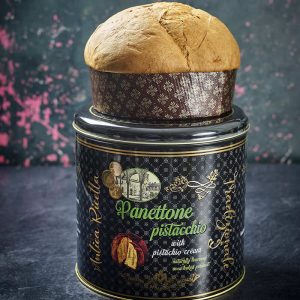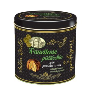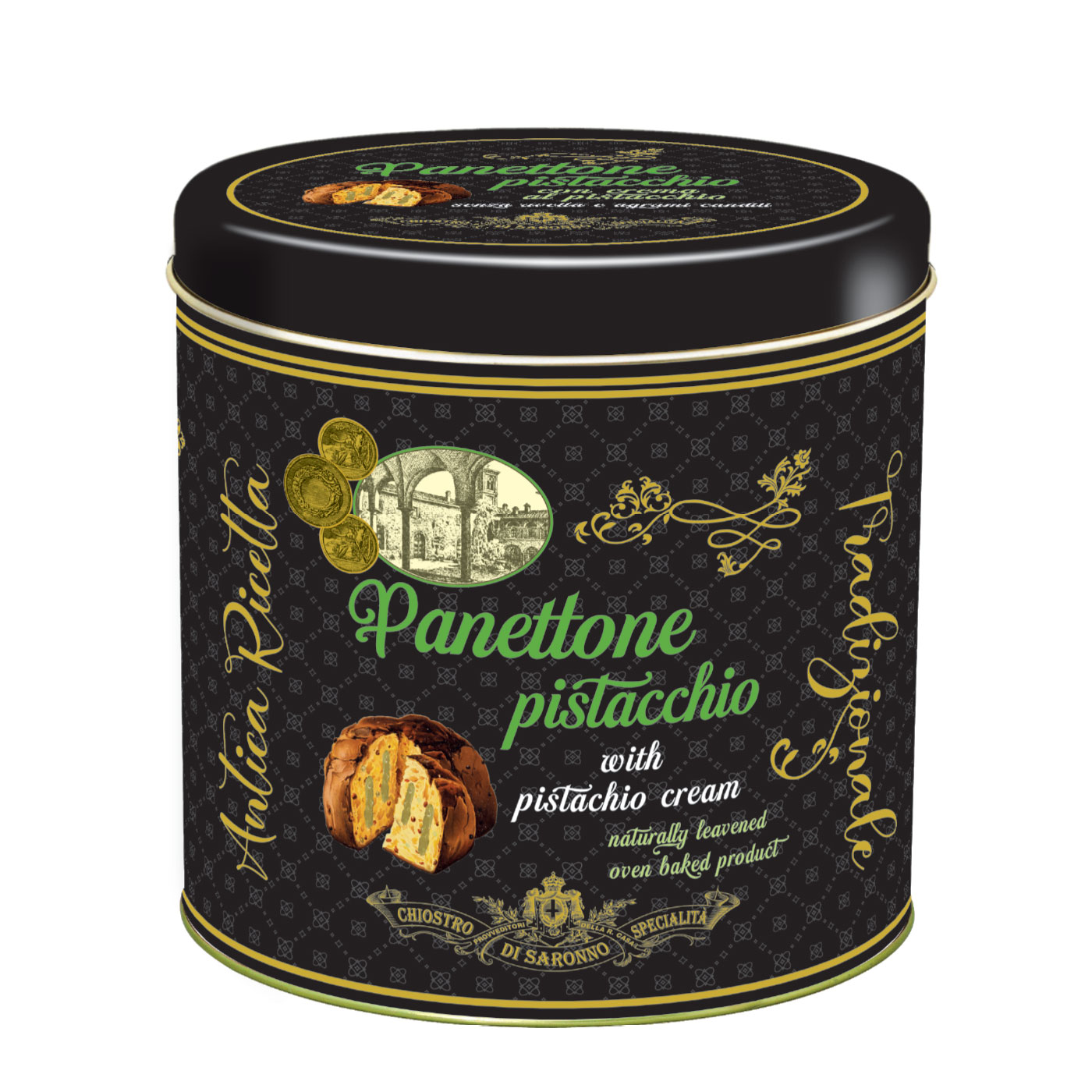 Panettone relleno de crema de pistacho, en lata edición Black Luxury. El Panettone Chiostro di Saronno se produce según la receta tradicional, basada en una levadura natural lenta, y todos los ingredientes, desde la harina hasta la leche, desde los huevos hasta la mantequilla, desde la fruta confitada hasta la levadura, son de origen natural, frescos y genuinos, libres de conservantes y colorantes.